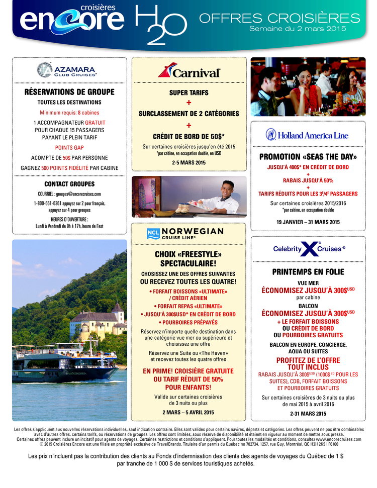 Vous retrouverez certaines des promotions des différentes compagnies de croisière à travers le monde. Que vous soyez une ou deux personnes ou un groupe nous pouvons vous trouver le navire ou l'itinéraire qui vous convient puisque nous avons accès à l'inventaire des compagnies de croisières autant maritimes que fluviales.